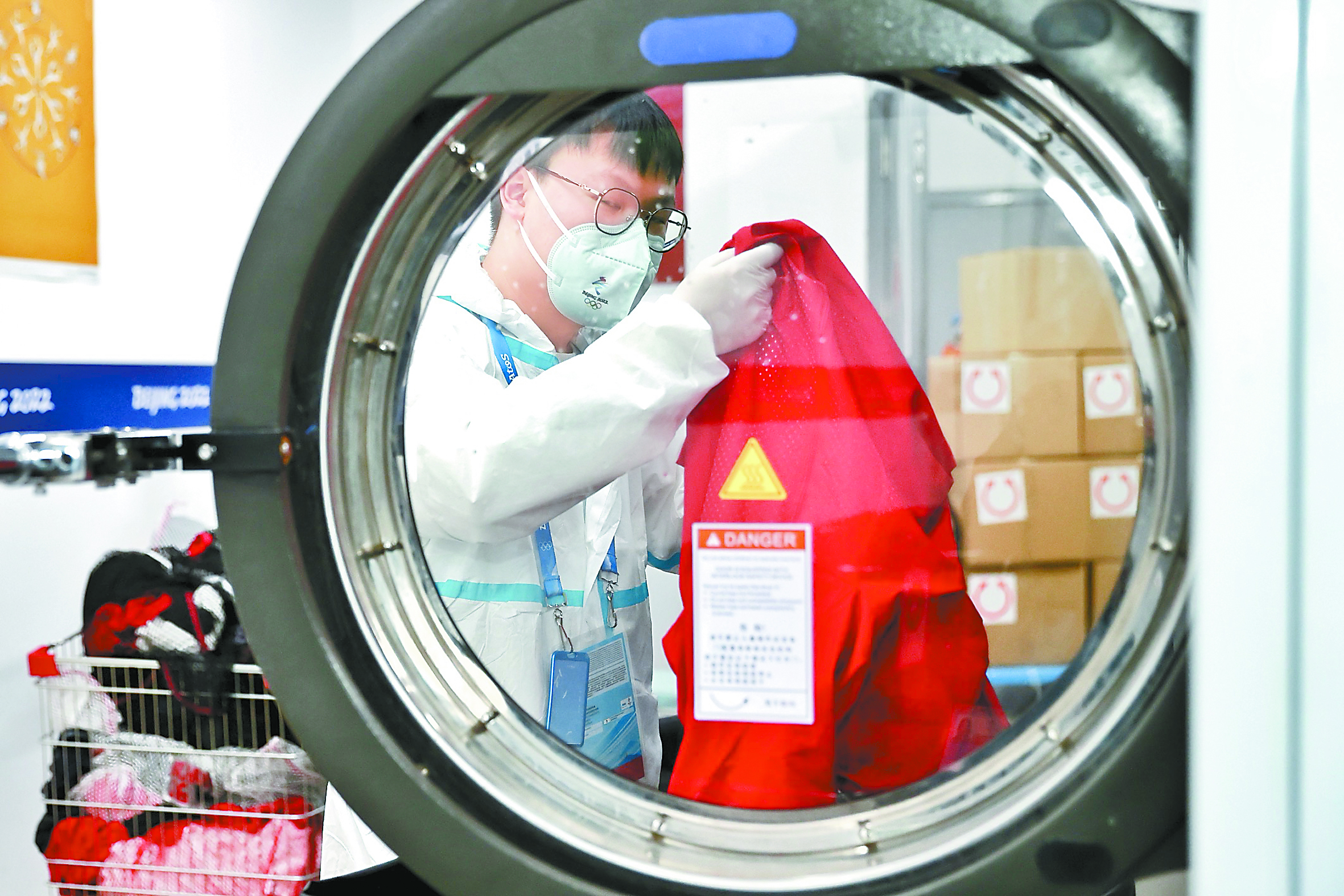 ▲国家体育馆,志愿者在洗衣房为运动员洗衣。