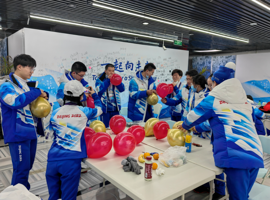 作为“志愿者的志愿者”,他们的工作早在去年10月就开始了,工作内容主要包括志愿者培训考核、疫情防控、宣传策划和激励等工作,大概三百平方米的“志愿者之家”是他们工作的主要阵地。中国戏曲学院团委副书记宝月主要负责带领小组成员进行宣传策划和激励的工作。宣传方面的工作人们都比较熟悉,他们会通过视频和简报的形式宣传志愿者的工作;激励则更像是给志愿者送温暖。在宝月看来,鸟巢的志愿者来自各个高校,大都是在校生,很多人都是第一次不在家过年,所以激励的工作尤为重要,“鸟巢志愿者的工作时间长,要服务四场仪式,工作量大,人数也最多,要让他们在这里感受到家的温暖,他们做志愿工作的热情就会更高。”