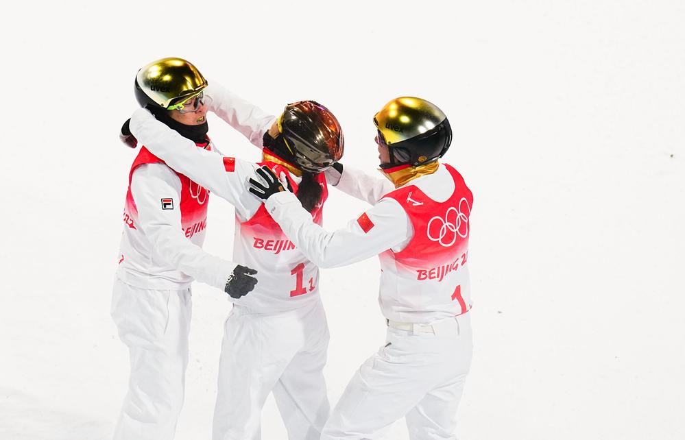 2月10日,中国队选手徐梦桃(中)赛后与队友齐广璞(左)、贾宗洋在一起。当日,北京2022年冬奥会自由式滑雪空中技巧混合团体决赛在张家口赛区举行,中国队获得亚军。新华社记者 许畅 摄