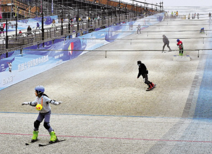▲游客在成都“金针菇”旱雪滑雪场上感受冰雪运动的快乐。