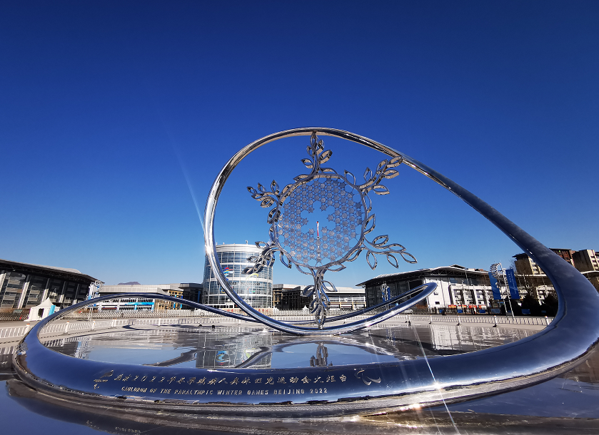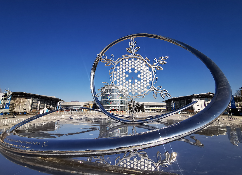 近日,延庆冬奥城市文化广场热闹非凡,广场中央的火炬台“长城之光”在阳光的照射下,折射出耀眼的光芒。在飘扬环绕的“银丝带”里,由一片片小雪花和6个橄榄枝组成的大雪花缓慢地旋转着,仿佛在翩翩起舞,轻盈而优雅。