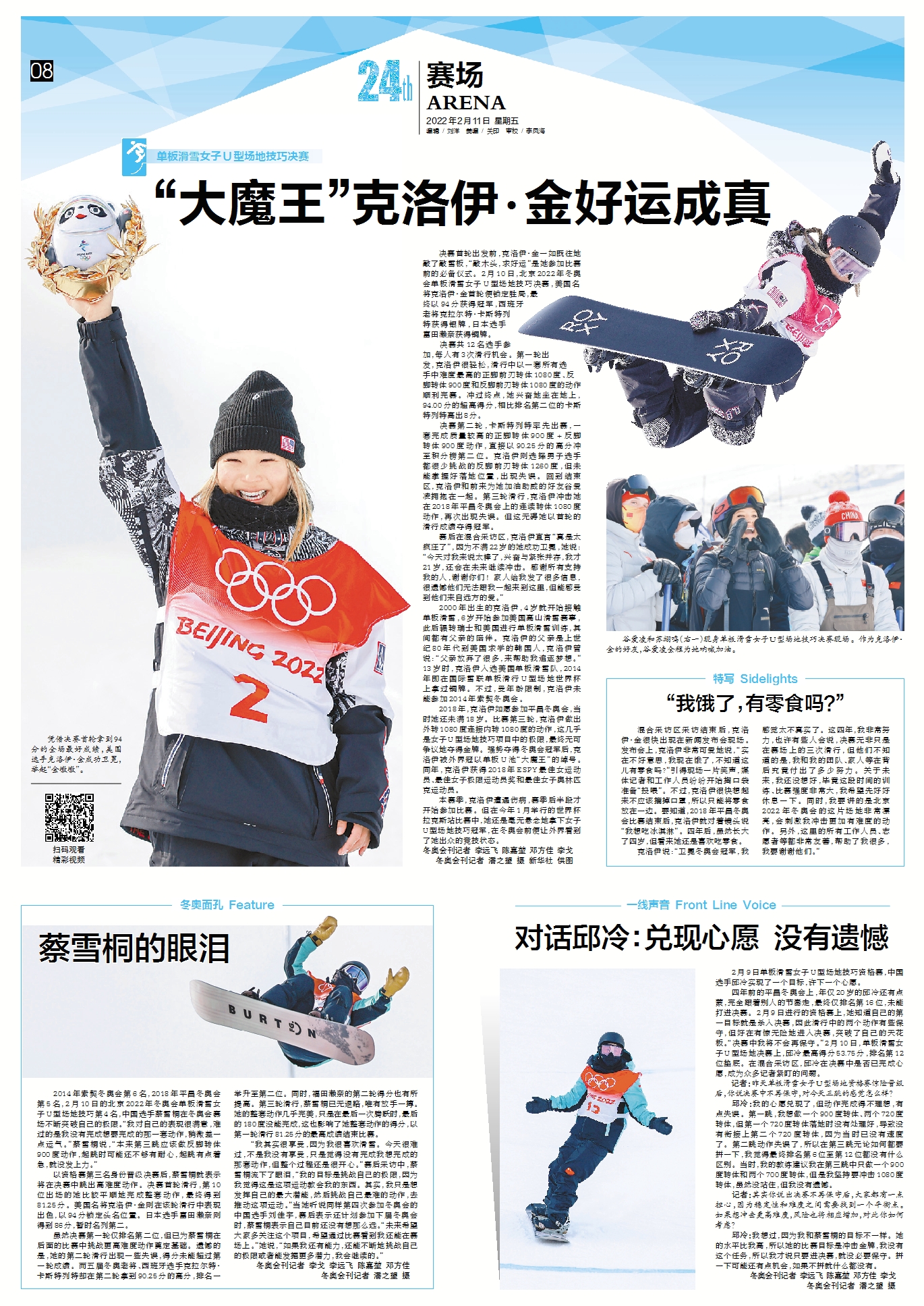 克洛伊说:“卫冕冬奥会冠军,我感觉太不真实了。这四年,我非常努力,也许有些人会说,决赛无非只是在赛场上的三次滑行,但他们不知道的是,我和我的团队、家人等在背后究竟付出了多少努力。关于未来,我还没想好,毕竟这段时间的训练、比赛强度非常大,我希望先好好休息一下。同时,我要讲的是北京2022年冬奥会的这片场地非常漂亮,会刺激我冲击更加有难度的动作。另外,这里的所有工作人员、志愿者等都非常友善,帮助了我很多,我要谢谢他们。”