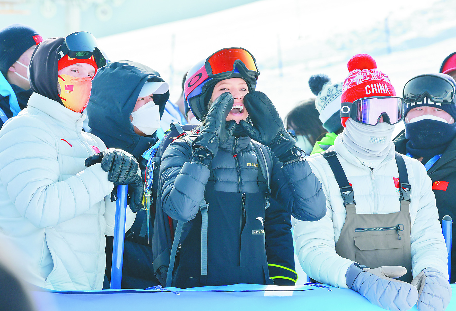 谷爱凌和苏翊鸣(右一)现身单板滑雪女子U型场地技巧决赛现场。作为克洛伊·金的好友,谷爱凌全程为她呐喊加油。