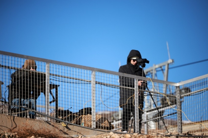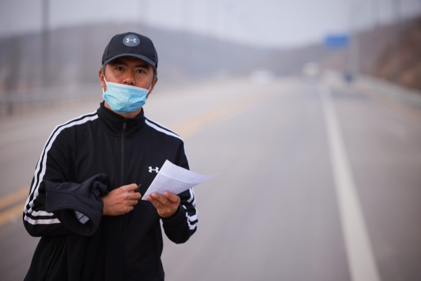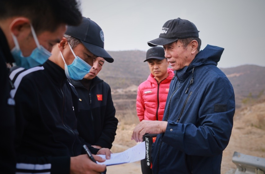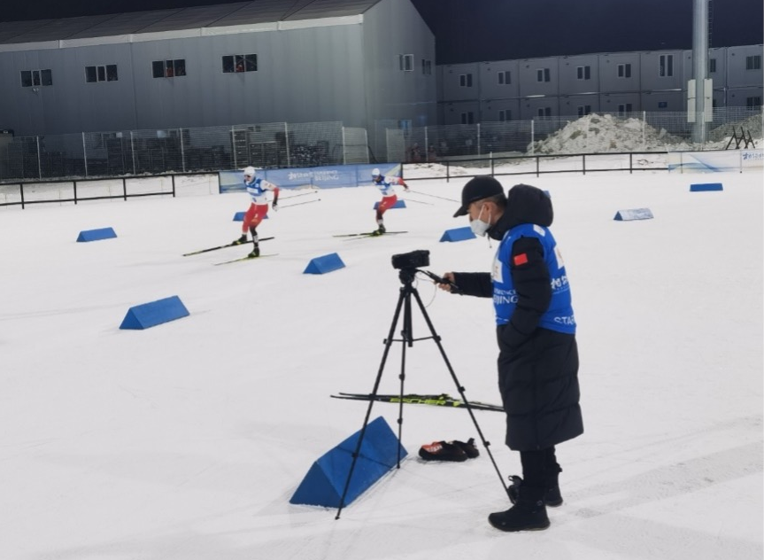 张栋在越野滑雪场地上拍摄运动员视频