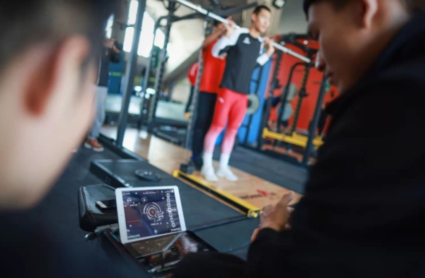 陈聪航在帮助运动员分析体能训练技术动作效果