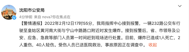 2022年2月12日17时55分,沈阳市公安局指挥中心接到报警,一辆232路公交车行驶至皇姑区黄河南大街与宁山中路路口附近时发生爆炸。