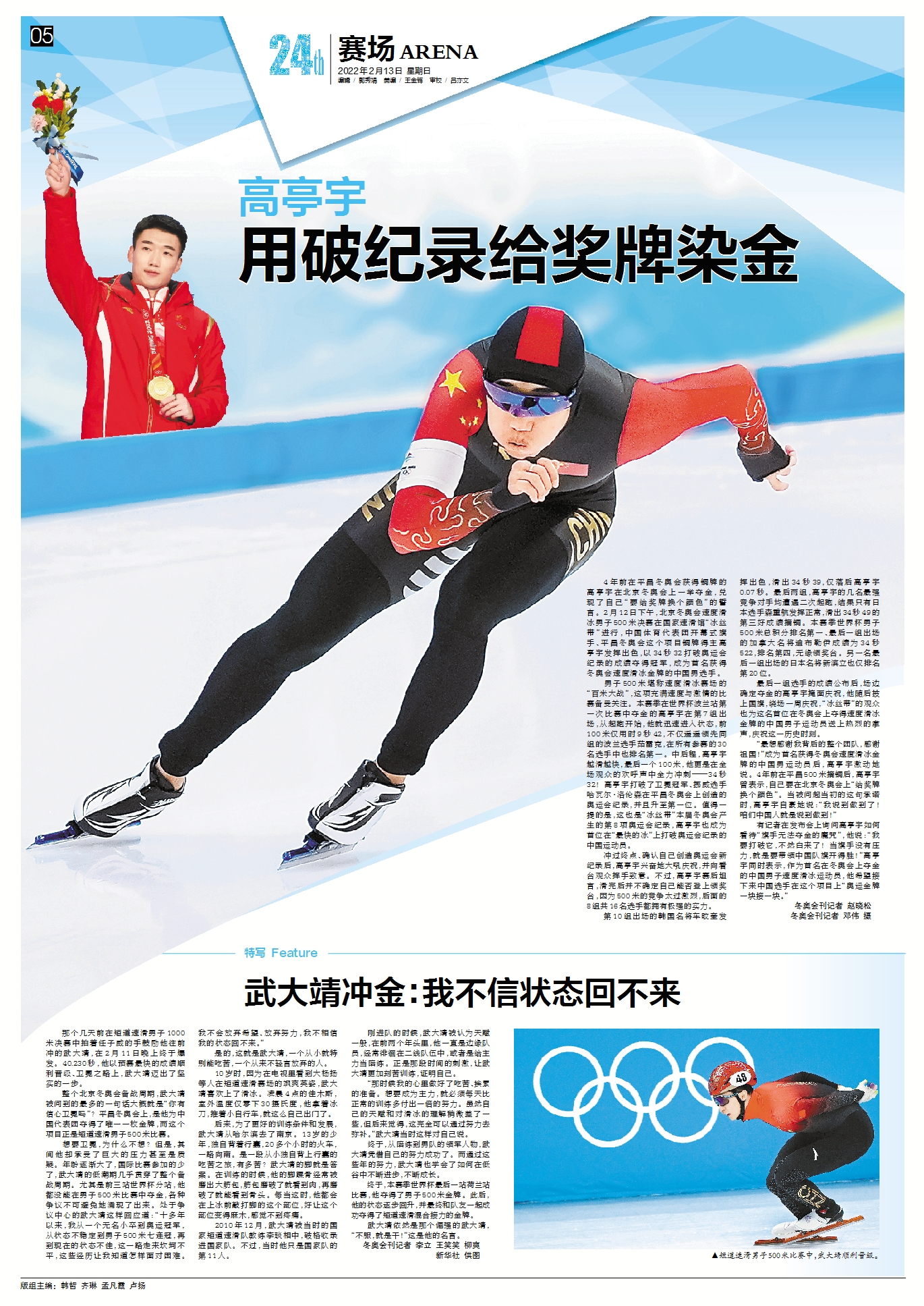 冲过终点、确认自己创造奥运会新纪录后,高亭宇兴奋地大吼庆祝,并向看台观众挥手致意。不过,高亭宇赛后坦言,滑完后并不确定自己能否登上领奖台,因为500米的竞争太过激烈,后面的8组共16名选手都拥有极强的实力。