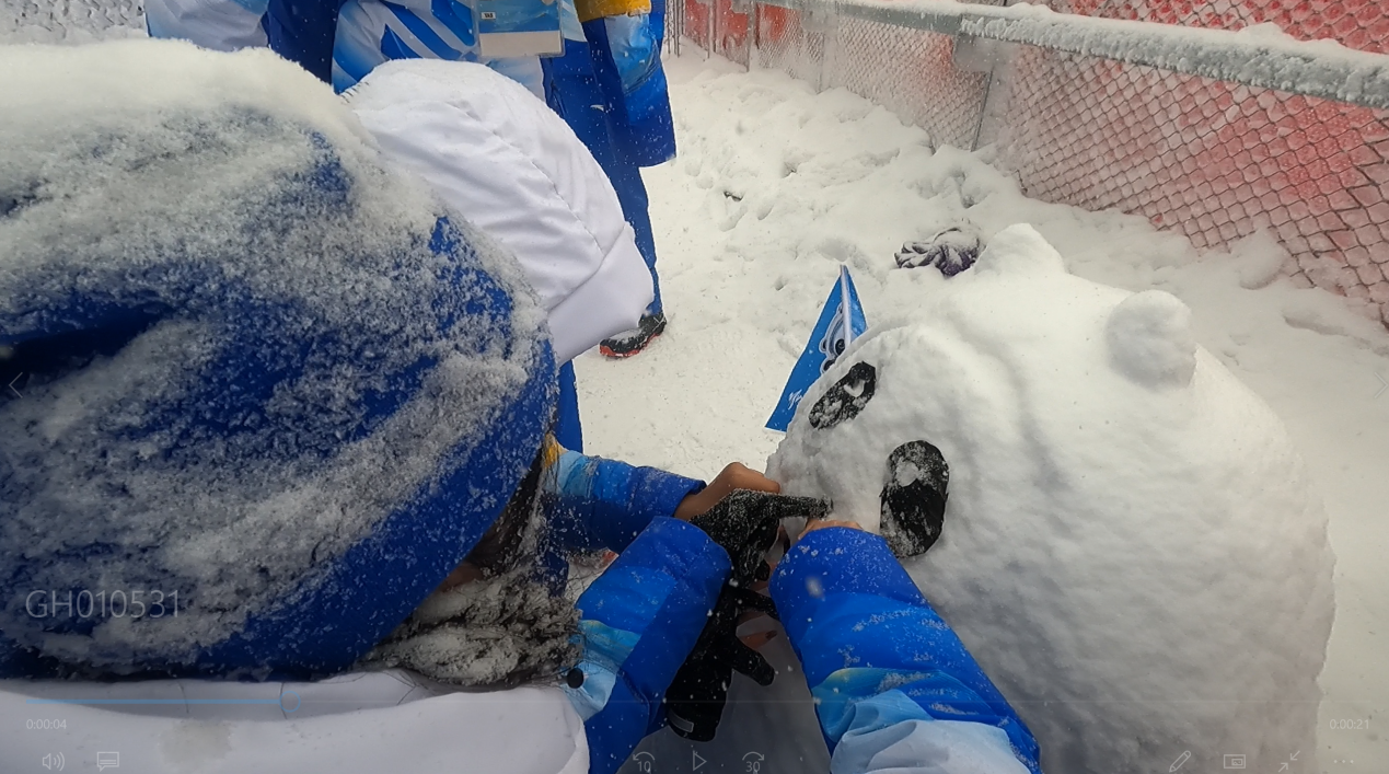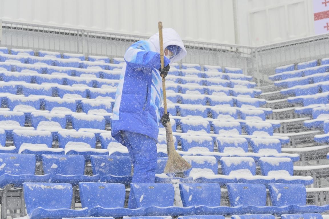 雪花飞扬,志愿者们配合清废、设施、交通、安保等相关领域迅速开展扫雪铲冰工作,清理观众流线,铺上防滑地垫,清洁看台座椅,笤帚扫、雪板推。尽管帽檐与衣襟早已被白雪覆盖,志愿者们仍然热情高涨,干劲不减。为了带给观众温馨独特的体验,看台志愿者在观众抵达前在观众入口处用积雪堆出了一个憨态可掬的“雪墩墩”,迎接观众的到来,惹人驻足。