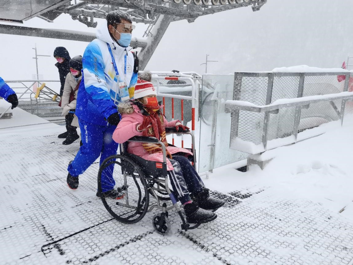 观众中有一位行动不便的小女孩,观赛保障的志愿者们为其提供了助行服务,观众抵达的第一刻便协助其坐在预先准备的轮椅上,帮助她穿好雨衣,遮挡风雪,到达看台更是细心地帮助扣紧锁止装置,退场时慢慢地后退穿过无障碍坡道,小女孩的家人很受感动,向志愿者们不断地致谢。