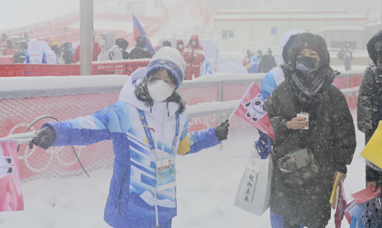 为应对大雪,观赛服务保障志愿者们暖心地为观众提供了雨衣、彩旗等观赛物资,致力于给观众带来更好的观赛体验。赛场大雾弥漫,能见度低,看台服务志愿者耐心地为观众讲解比赛进程,用热情的微笑点燃了整个赛场氛围。