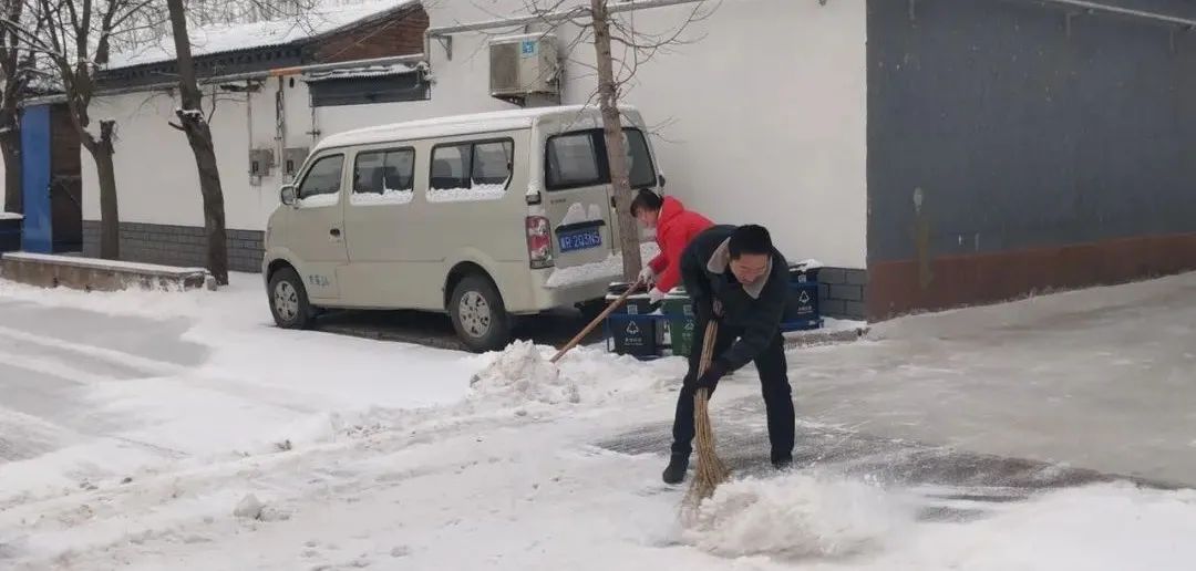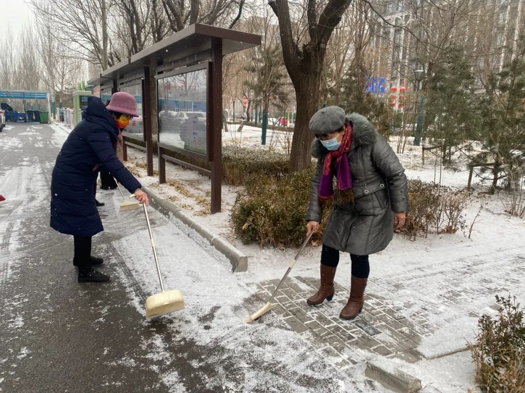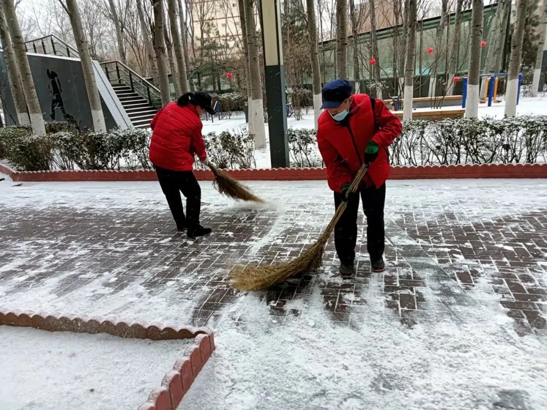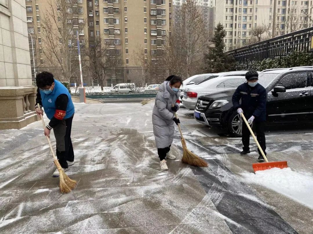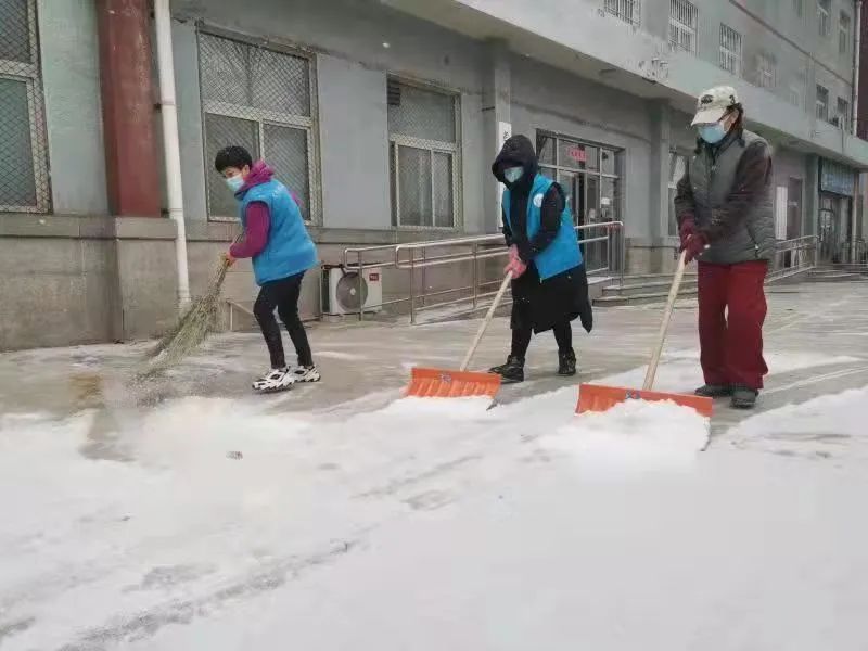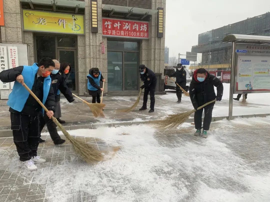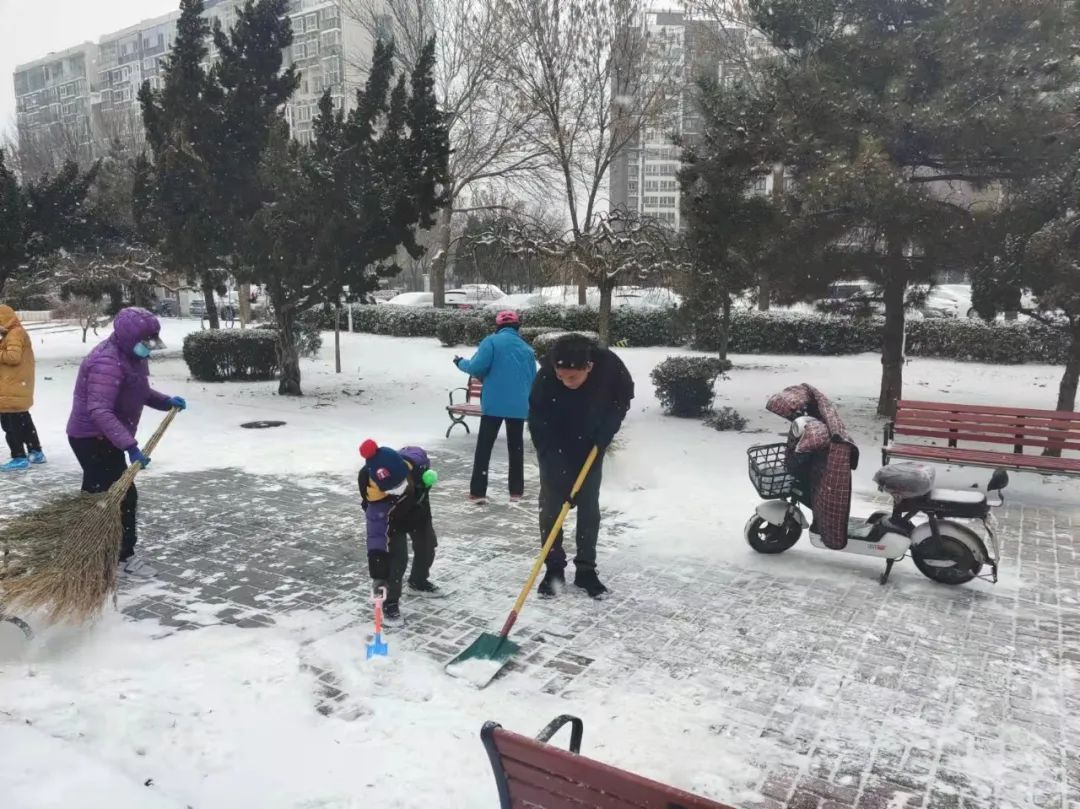 协调各物业及时清扫积雪、保证居民通行安全;各社区组织社工、志愿者开展扫雪铲冰活动,并结合新时代文明实践所、站开展各类活动;清源街道团工委组织12名青少年在滨河西里北区社区单元楼门前、公园内开展扫雪活动;学院社区组织辖区志愿家庭开展扫雪活动。