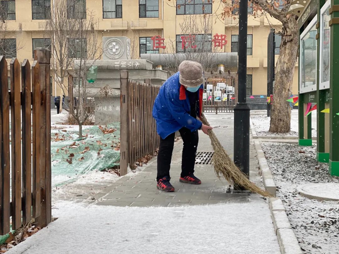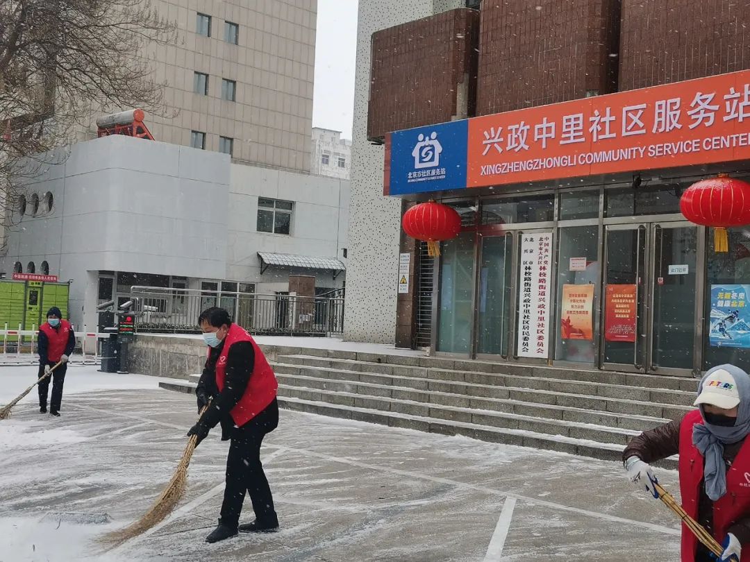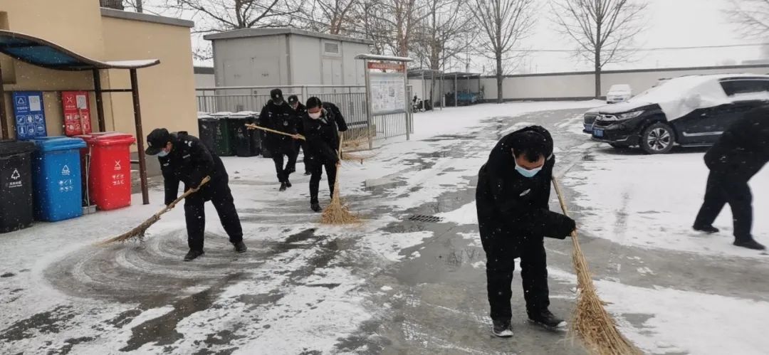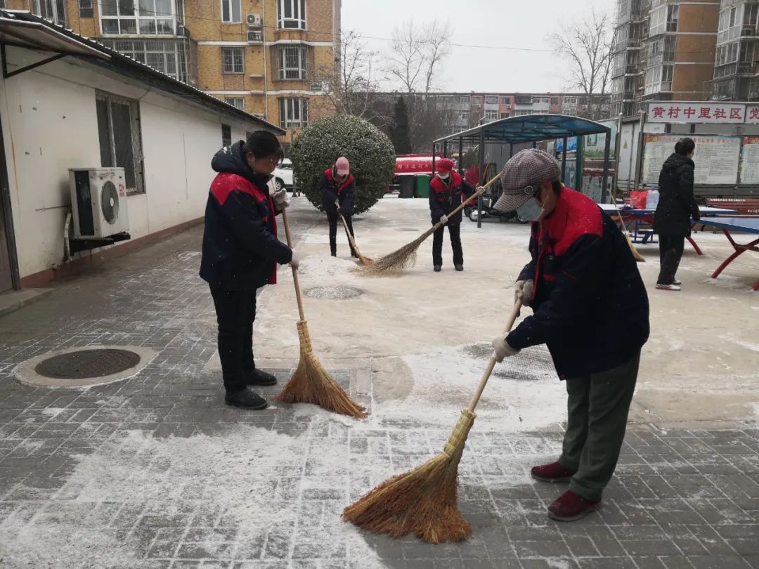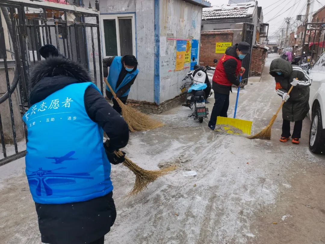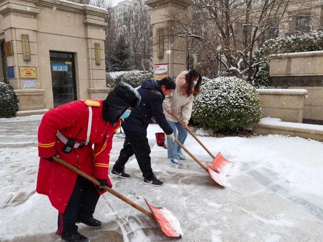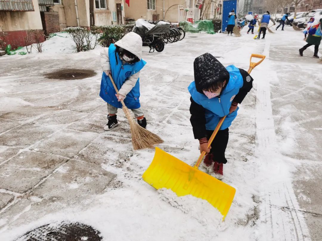 协调各物业及时清扫积雪、保证居民通行安全;各社区组织社工、志愿者开展扫雪铲冰活动,并结合新时代文明实践所、站开展各类活动;清源街道团工委组织12名青少年在滨河西里北区社区单元楼门前、公园内开展扫雪活动;学院社区组织辖区志愿家庭开展扫雪活动。