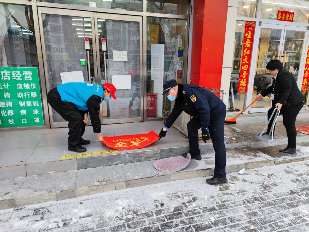 督促商业街各门店积极落实“门前三包”责任制与扫雪铲冰责任,并与商户共同开展扫雪铲冰行动,避免形成残冰积雪,引发安全事故。