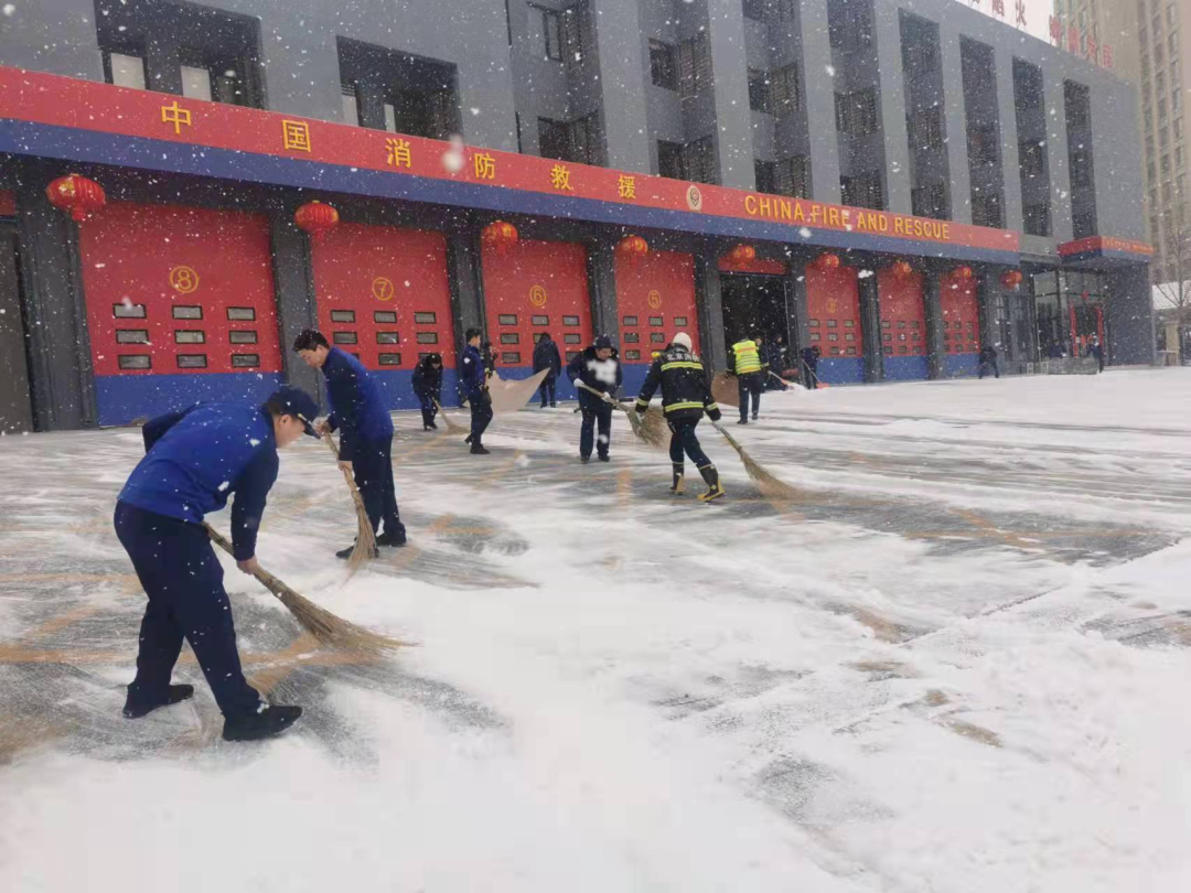 各消防救援站消防救援人员一起清扫辖区内积雪,防止辖区内居民因积雪融化结冰而引发人员受伤事故,让居民们出门更加安心。