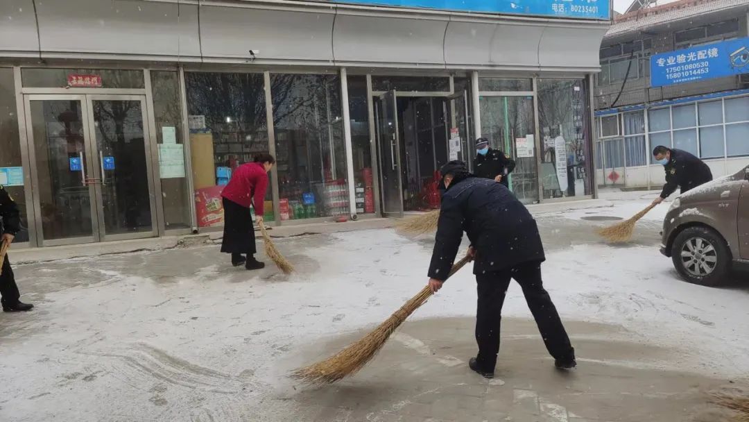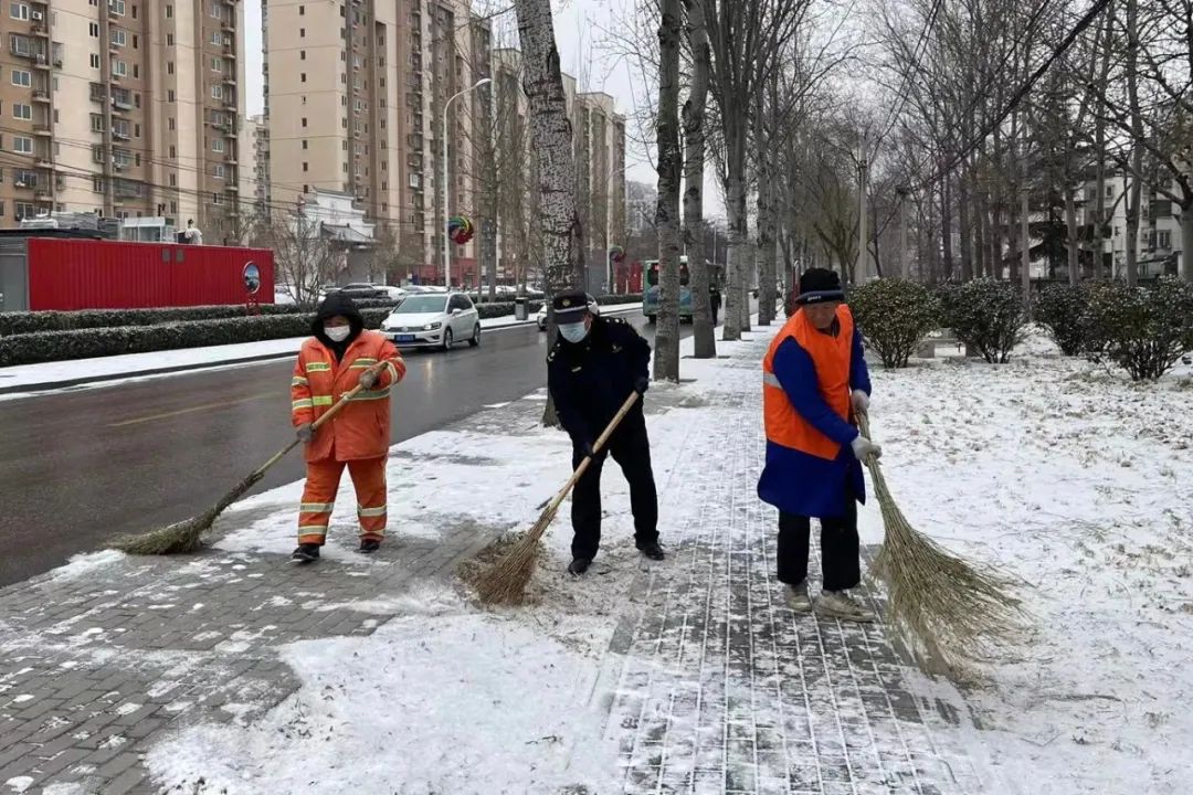 各街道、社区工作人员分区划片督促及协助各单位进行扫雪,努力维护好雪天期间的街面环境,确保辖区道路通行安全顺畅。