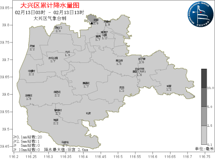 截至16时30分全区平均降雪量3.4毫米,最大降雪量出现在黎明村、旧宫4.1毫米,本站积雪深度5厘米。目前大兴区正处于道路结冰黄色预警信号、大雾黄色预警信号、暴雪蓝色预警信号中。