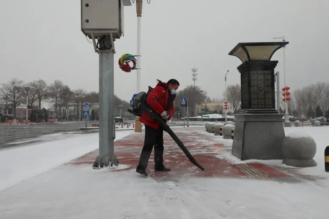 以人工、吹雪机器、扫雪车形式进行扫雪铲冰工作,保证主次干道、各园区主要活动场所及园路的安全畅通。共出动人员400余人,扫雪车辆20余台。及时清理因积雪、冰冻导致的倒树、断枝,并对各园区公共设施、电力设备等进行安全检查。