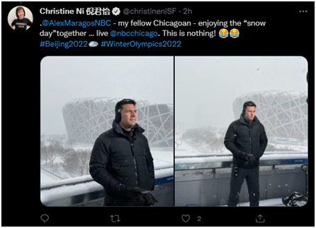 美国全国广播公司(NBC)华裔记者倪君怡发布了他们在鸟巢附近现场报道的情况,并配文称自己的同事很享受这个“大雪天气”。