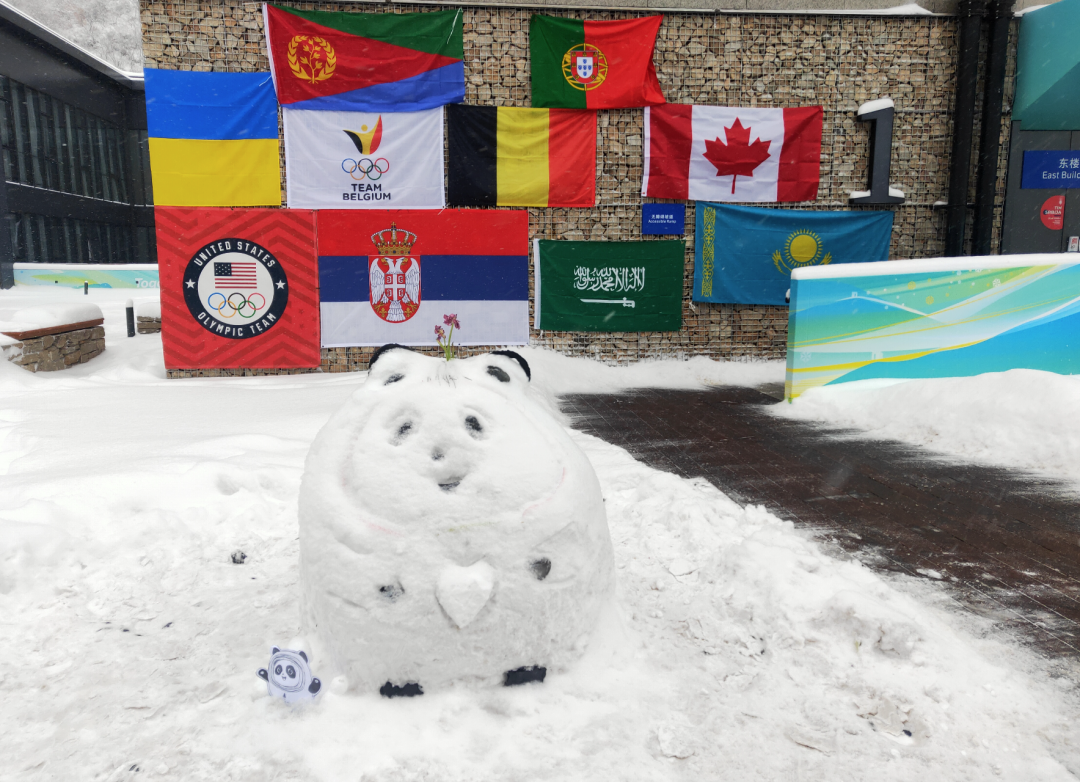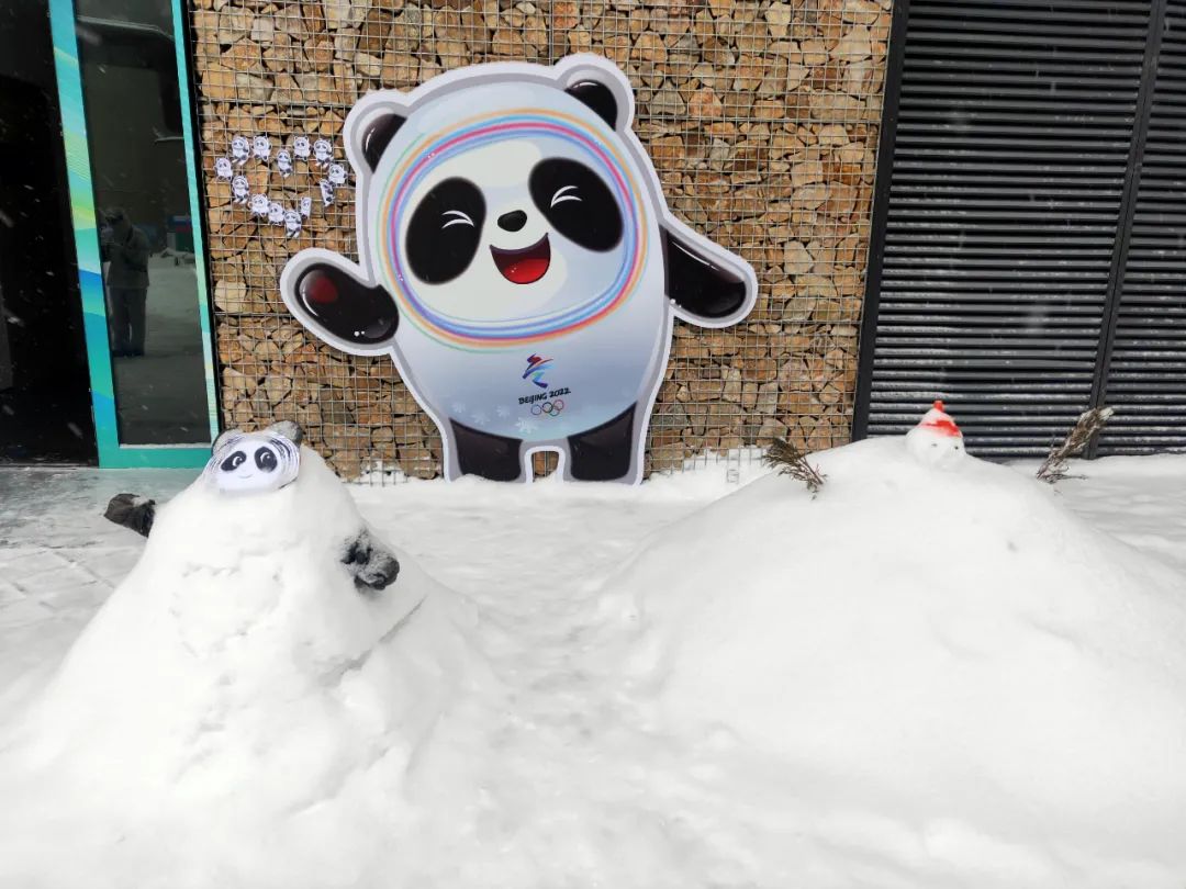在服务中心的楼下,志愿者们精心创作的冰墩墩与雪容融“站”在门口,欢迎前来办理业务、寻求帮助的各国运动员。不少外国友人路过时都会停下脚步,和两个可爱的小雪人拍照留念。