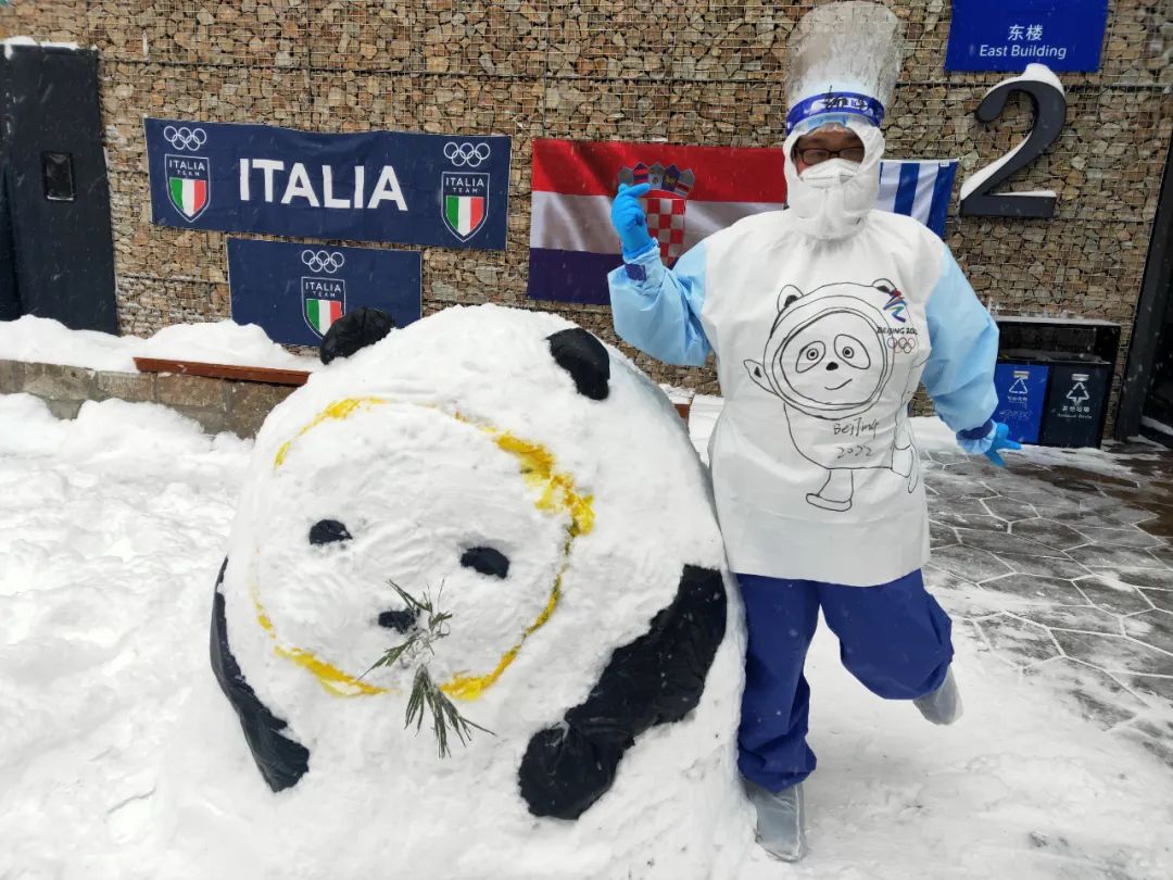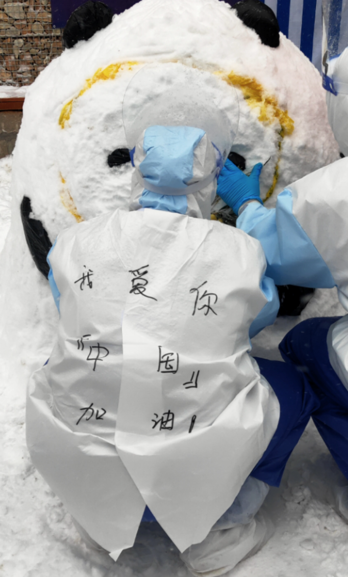 另一边,居民楼的工作人员们正在为一个超大号冰墩墩做最后的收尾。他们在自己的防护服上也画了可爱的冰墩墩,背面写着“我爱你,中国加油!”几个大字。一位志愿者把一枝竹叶插在了雪人上,他说:“我们堆的冰墩墩是村子里最好看的!”