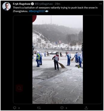 澳大利亚《悉尼先驱晨报》《时代报》记者埃里克·巴格肖同样也发布了一段清雪视频,赞扬工作人员:“在张家口,一大批扫雪人员在勇猛地清理着大雪。”