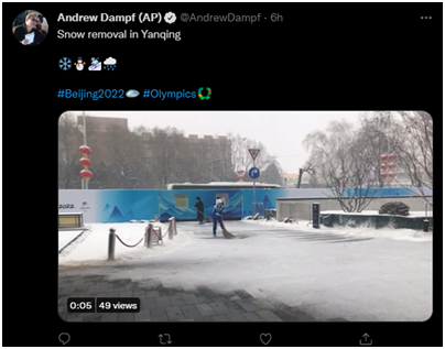 还有一些外媒记者关注到这场雪下得不小,很多工作人员在辛勤清扫。美联社体育频道记者安德鲁·丹普夫就发了一段视频,配文称:“在延庆的降雪清理(工作)。”