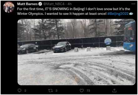 赞叹雪景的还有美国全国广播公司(NBC)主持人马特·巴恩斯,不过他自称似乎不太喜欢下雪天,但他仍发文表示:“(我来的)第一次,北京下起了雪!我不太喜欢下雪,但这是冬奥会啊。我想至少看到一次!”