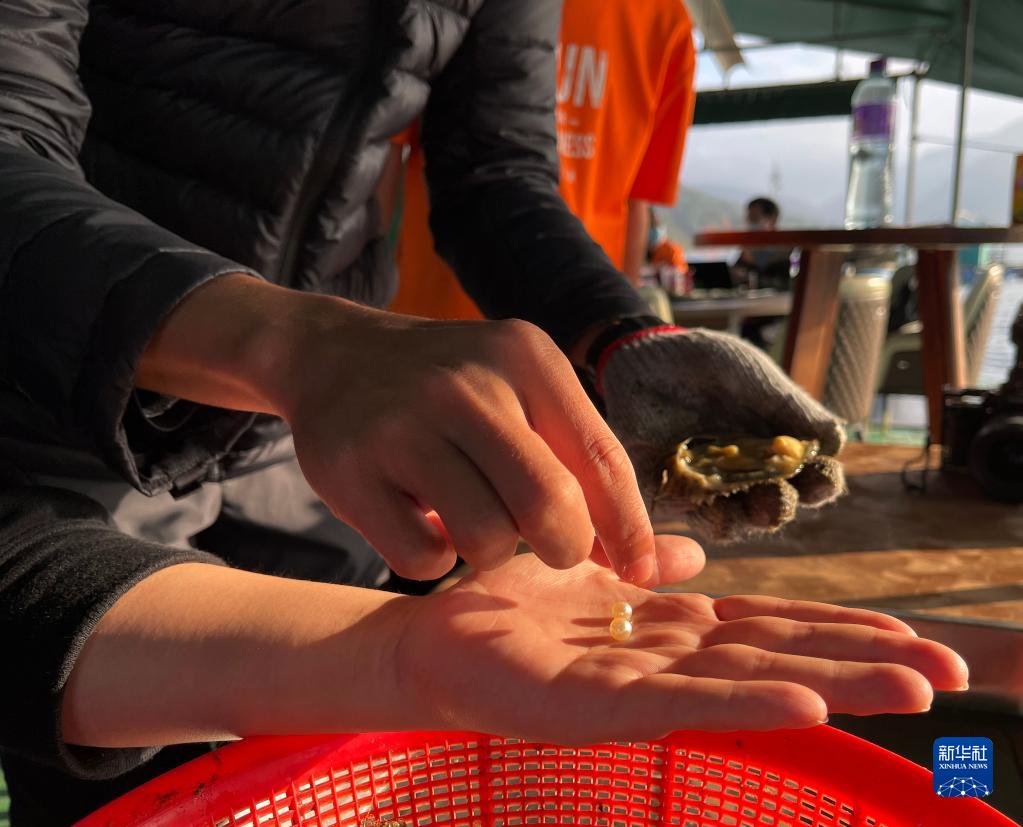 渔民向记者展示养殖的珍珠(1月27日摄)。新华社记者 李钢 摄