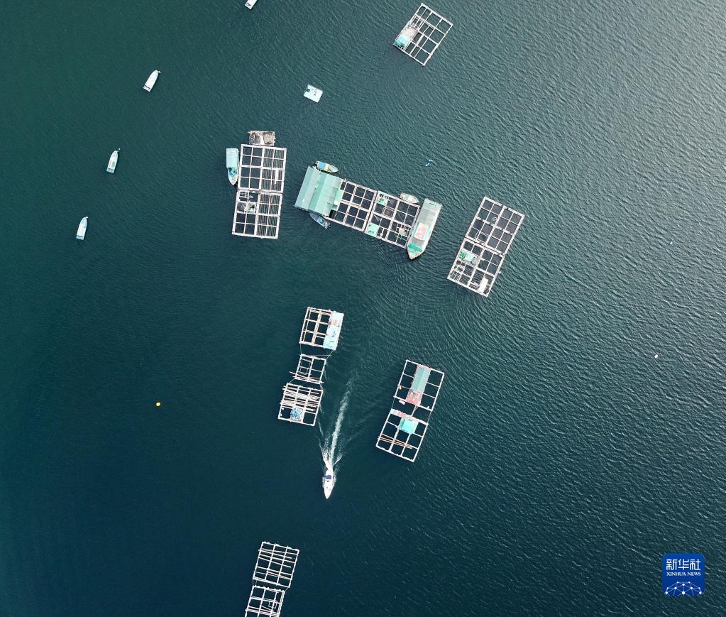 在香港西贡海域,一艘小艇穿过网箱组成的渔排(1月27日摄,无人机照片)。新华社记者 李钢 摄