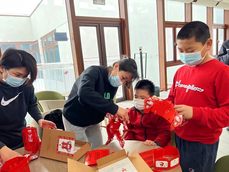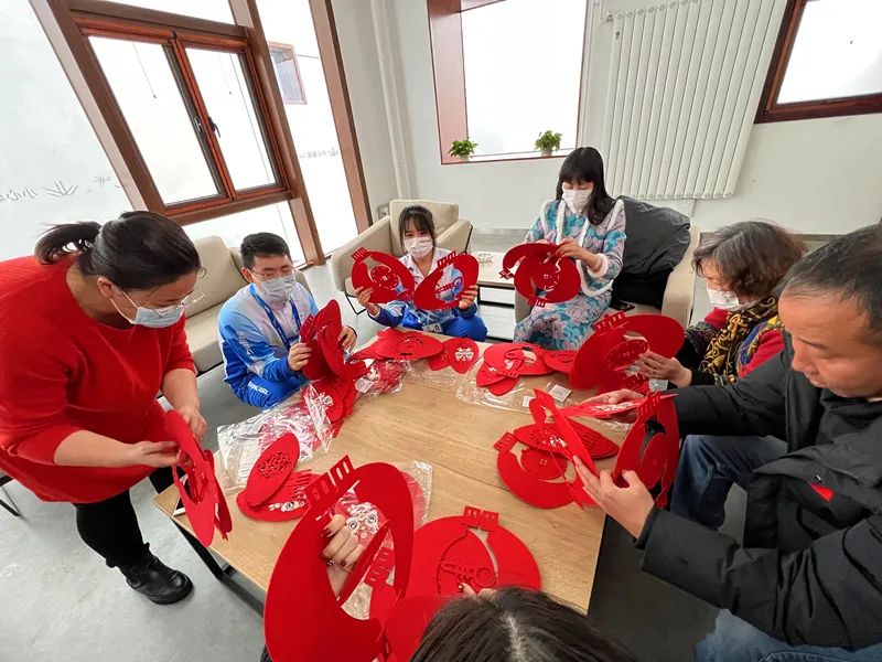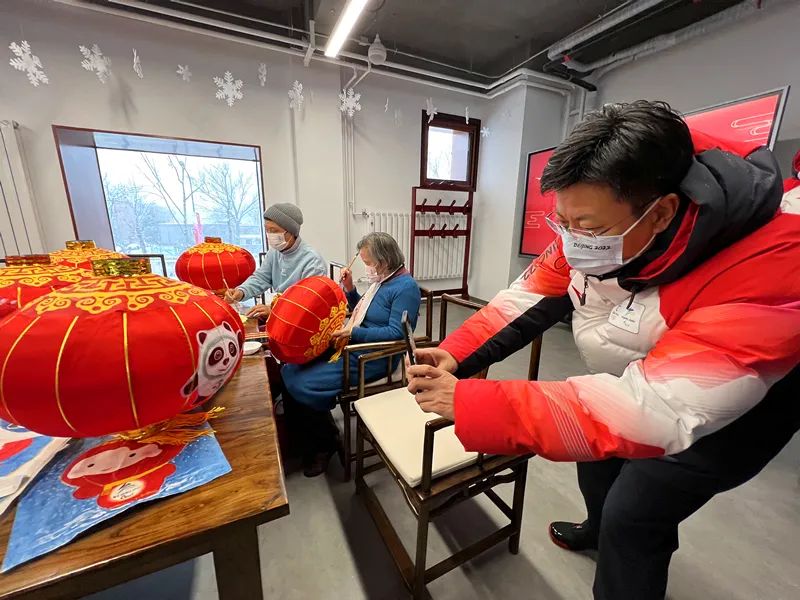 活动现场喜庆热闹,冬奥志愿家庭的成员们手工制作了精巧的工艺灯笼,书画班成员在灯笼上精心绘制各式各样的书画作品。梅、兰、竹、菊这些极富中华民族传统文化寓意的图案在书画班成员们的妙笔下栩栩如生,红灯笼摇身一变成为了洋溢“中国式浪漫”的艺术品。