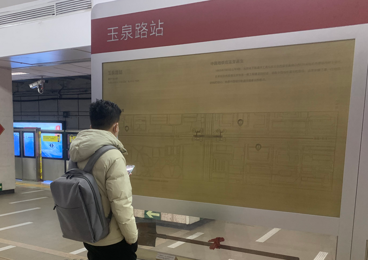 “1965年7月1日上午9时,北京地下铁道开工典礼在北京西郊玉泉路以西500米处的两棵银杏树下举行。在本站你将跟随北京地铁一期工程建设的印迹,亲临中国地铁诞生的现场,这里珍藏了第一代地铁人的灿烂初心,也是中国城市轨道交通建设的原点。”在玉泉路地铁站的新展览牌上,这样的一段话吸引了不少乘客和市民。