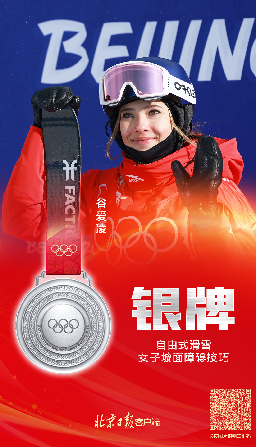 张家口赛区云顶雪上公园进行的自由式滑雪女子坡面障碍技巧决赛中,中国选手谷爱凌凭借第三轮的出色发挥,以86.23分取得亚军。北京冬奥会上,她已经收获一金一银。