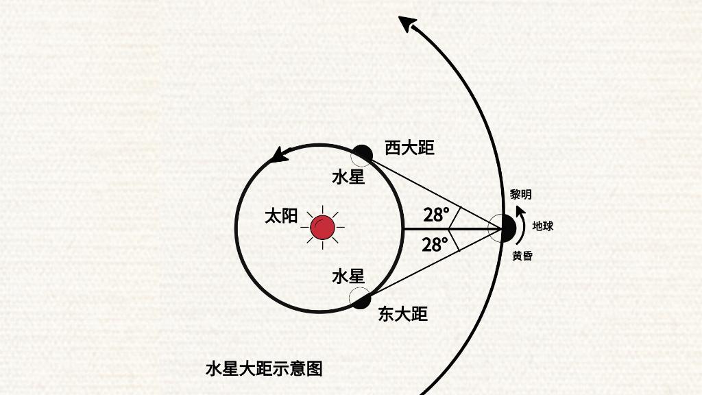 大距有东、西之分,水星在太阳最东边被称为东大距,在太阳最西边被称为西大距。东大距前后,水星在黄昏时分出现在西方地平线上方,这个时段它被称为“昏星”;西大距前后,水星则在黎明时的东方低空出现,这个时段它被称为“晨星”。