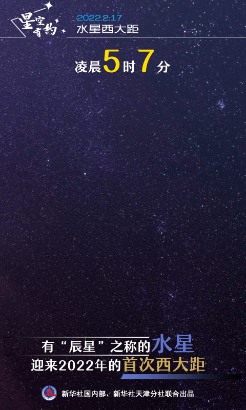 新华社天津2月15日电 天文科普专家介绍,2月17日凌晨5时7分,太阳系八颗行星中的水星将迎来2022年第二次大距,也是首次西大距。届时如果天气晴好,且大气透明度足够好,在本次大距前后的几天清晨,我国有兴趣的公众凭借肉眼或双筒望远镜有望目睹或观测到这颗平日里难得一见的神秘行星。