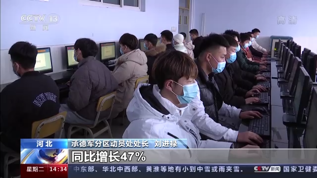 河北省承德军分区动员处处长 刘进禄:全市截至目前,大学生报名3860人,同比增长47%,大学毕业生报名1520人,同比增长51%。