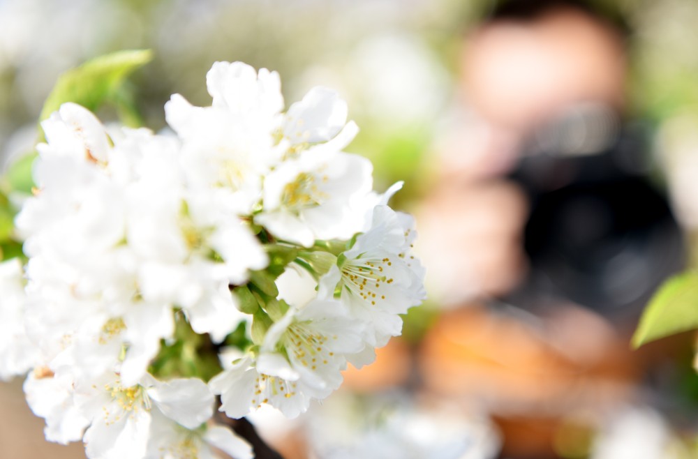 2022年2月16日,游客在张家口市宣化区洋河南镇金坤农业观光园观赏樱桃花。