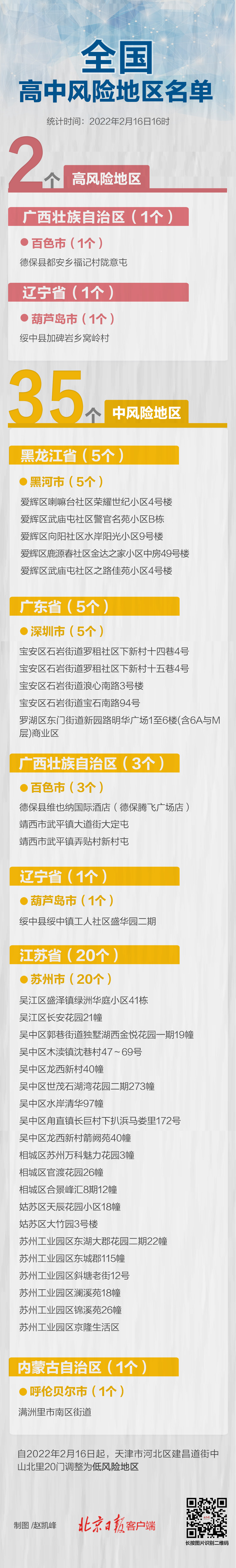 自2022年2月16日起,天津市河北区建昌道街中山北里20门调整为低风险地区。自此,天津市中高风险地区全部清零,所有地区均为低风险地区。
