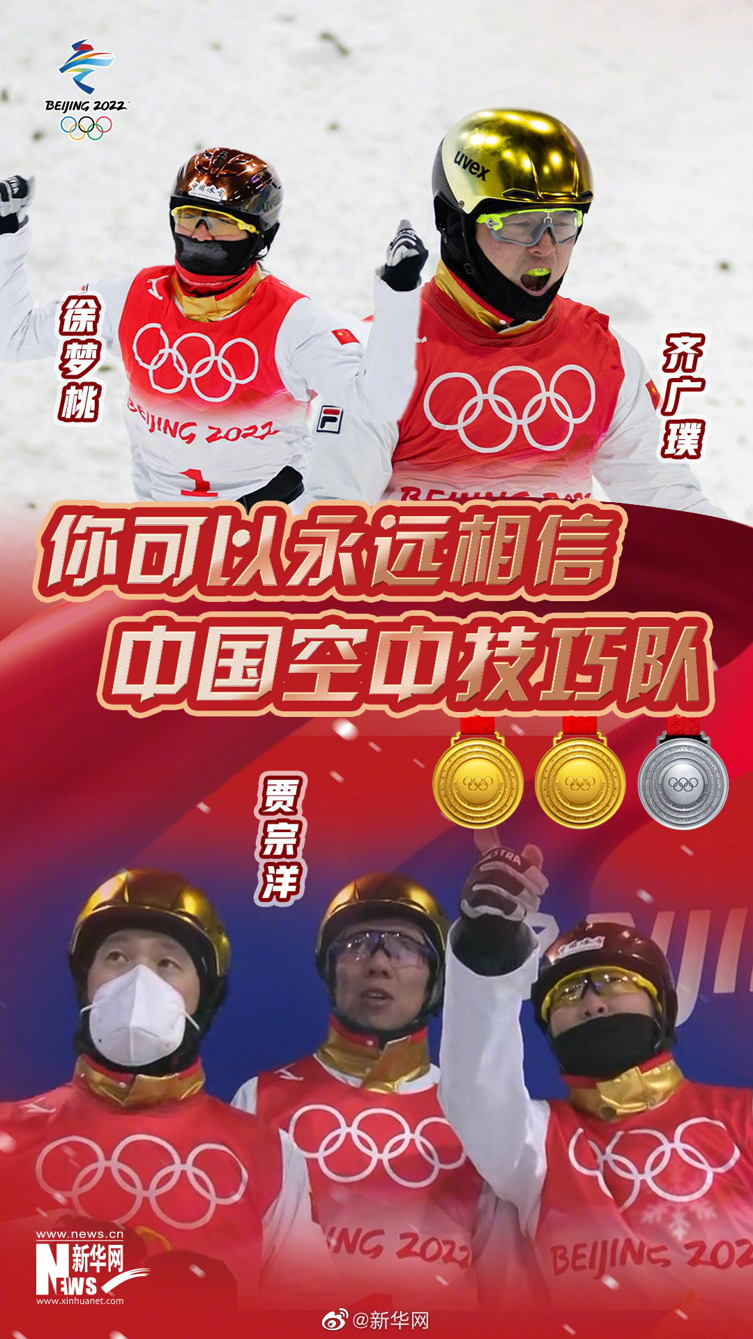 在北京冬奥会中,徐梦桃夺得女子空中技巧决赛金牌,齐广璞夺得男子空中技巧金牌,中国空中技巧队夺得空中技巧混合团体银牌。中国奥运健儿,你们永远是好样的!期待你们未来的表现!!