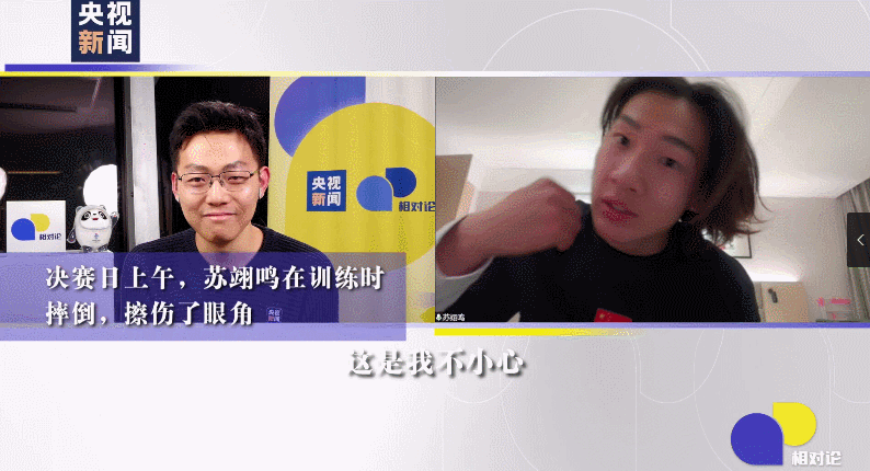 苏翊鸣:这是我不小心磕到的,有一个伤痕,会有一点点紧张。可能因为角度或者是落地的问题,雪镜往下窜了一点,正好碰到脸的位置。