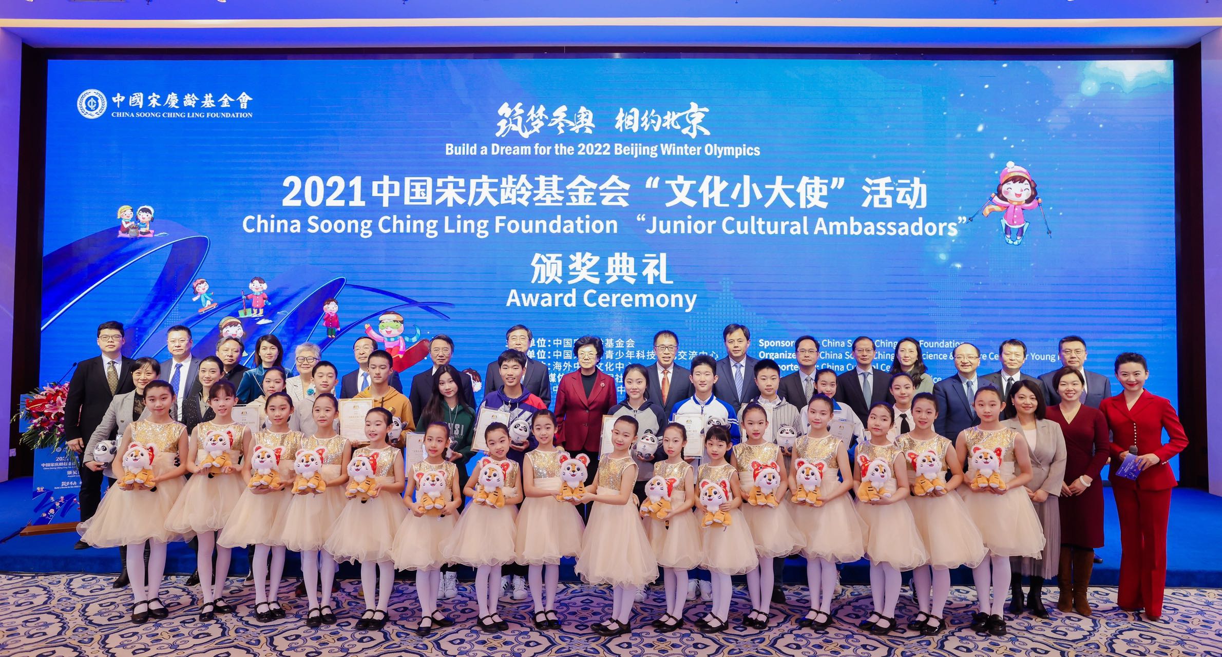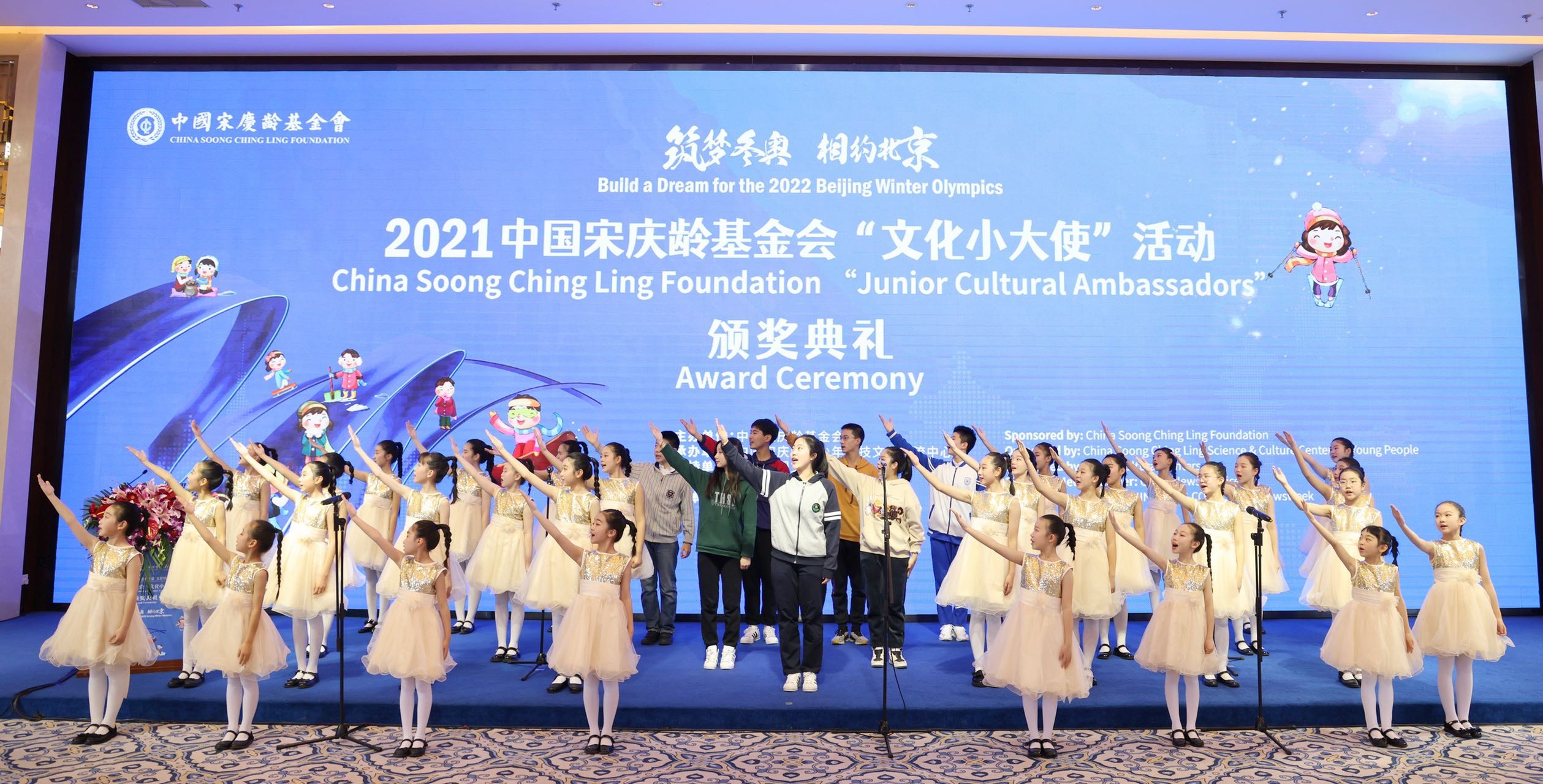 颁奖典礼上,宋庆龄和平天使艺术团的小朋友与在京的“文化小大使”活动获奖者代表共同表演了《一起向未来》手势舞,祝福北京冬奥会取得圆满成功,赢得线上线下嘉宾的热烈掌声。