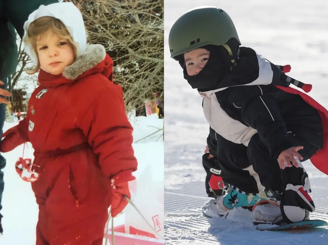 拼图照片:江红当年拍摄的法国小萌娃(左)和如今在雪场上驰骋的中国小雪友