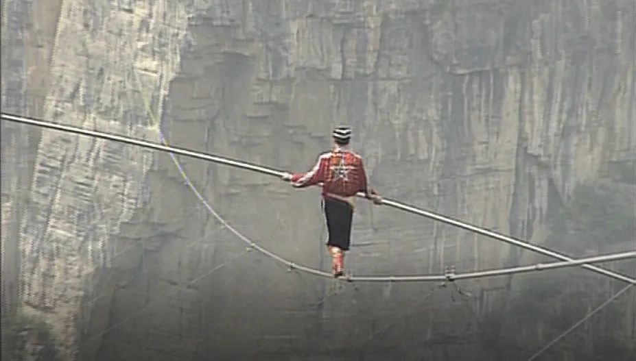 挑战起点在奉节夔门的老鹰嘴,科克伦当时是坐直升机上去的,阿迪力为了省钱,是自己扛着平衡杆走上去的,走了一个小时。到达终点的时候,我当时也顾不上伤口疼了,冲上去一把抱住他,激动得热泪盈眶。