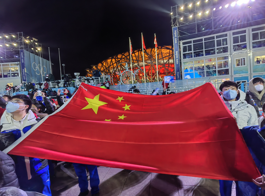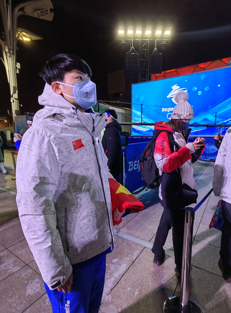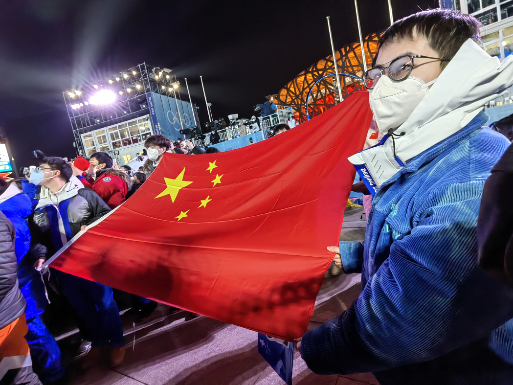 从任子威领奖的那个晚上开始,主媒体中心的志愿者便自发前往颁奖广场高举国旗,为现场增添“中国红”。第一次只有4个人,后来人数慢慢增多,直到苏翊鸣领奖的那个晚上,共有16名志愿者共携带4面五星红旗去到现场。