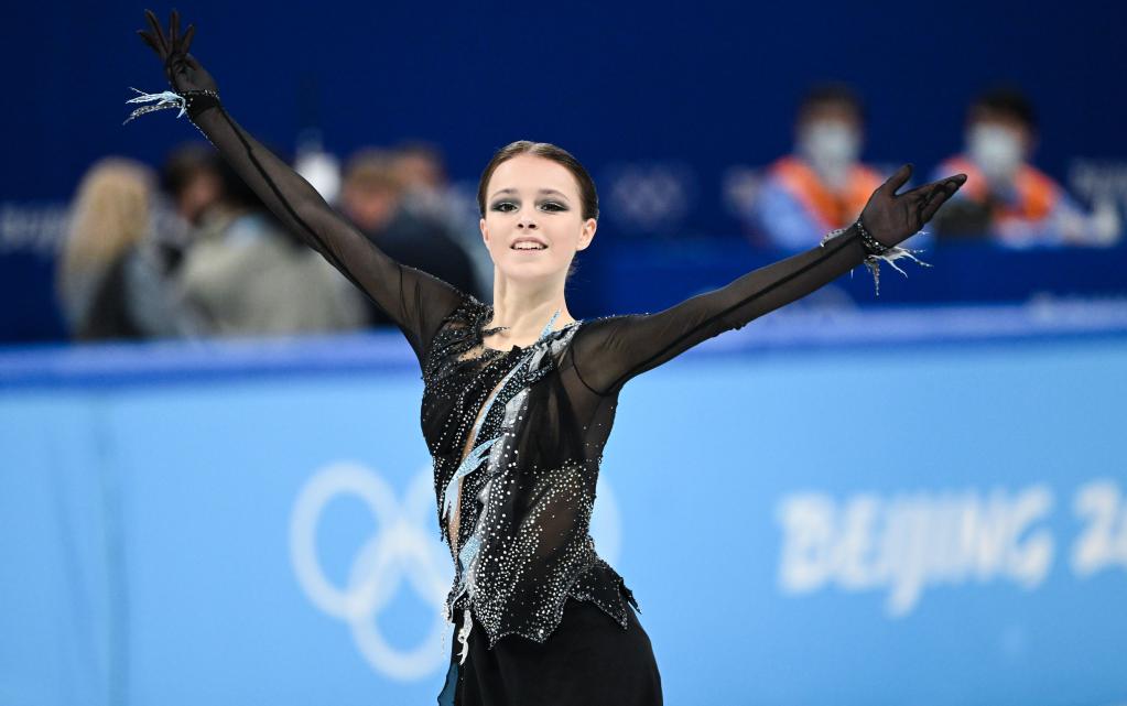 2月15日,俄罗斯奥委会选手安娜·谢尔巴科娃在花样滑冰女子单人滑短节目比赛中。 新华社记者马宁摄
