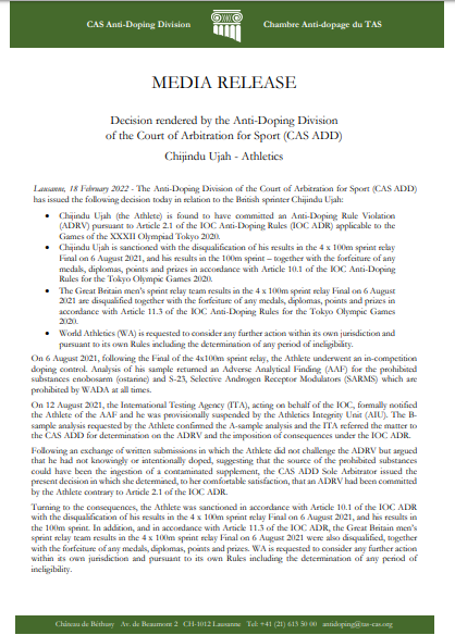 国际检测机构随即将该事件转交至国际体育仲裁法庭反兴奋剂部门。直到如今,国际体育仲裁法庭终于公布了相关结果。乌贾被认定兴奋剂违规,英国队的成绩被取消。这意味着,在东京奥运会男子4×100米接力决赛中获得第四名的中国队,离奖牌越来越近了。