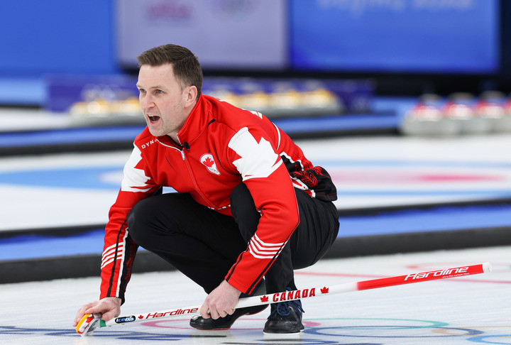 2月18日,加拿大队选手布拉德·古休在北京冬奥会冰壶男子铜牌赛比赛中。新华社记者王婧嫱摄