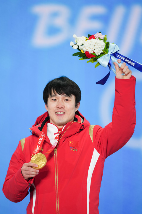 2月17日,冠军中国选手齐广璞在北京冬奥会自由式滑雪男子空中技巧奖牌颁发仪式上。新华社记者牟宇摄