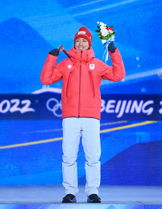 2月16日,季军日本选手渡部晓斗在北京冬奥会北欧两项个人赛跳台滑雪大跳台+越野滑雪10公里奖牌颁发仪式上。新华社记者戴天放摄