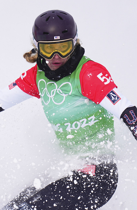 2月12日,美国选手琳赛·雅各贝利斯在比赛中。美国选手尼克·鲍姆加特纳和琳赛·雅各贝利斯组成的美国一队获得单板滑雪障碍追逐混合团体比赛的冠军。新华社记者许畅摄