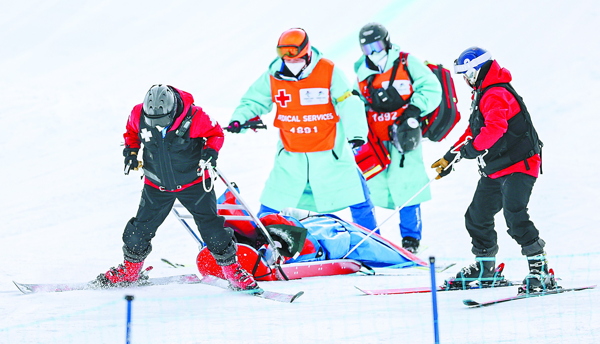 2月9日的单板滑雪女子障碍追逐决赛中,捷克选手霍普亚科娃受伤,现场的医务人员和救援人员立即开展施救。